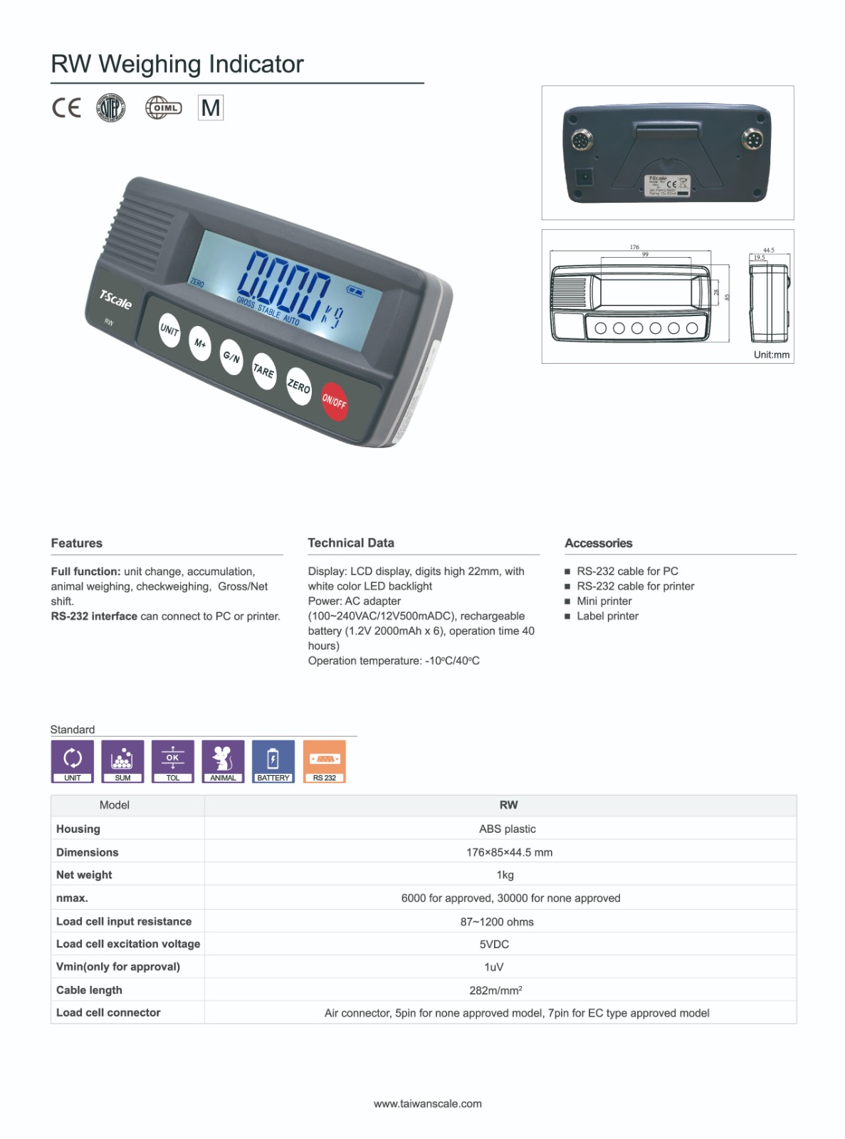 Approvals: OIML, NTEP Divisions: 6,000e; 30,000d; Display:22mm digits LCD display with white LED backlight Key Board:6 keys mechanical Standard: (1.2V/2000mAh x 6) Ni-MH batteries up to 40 hours continuous use (without backlight) Optional:RS232