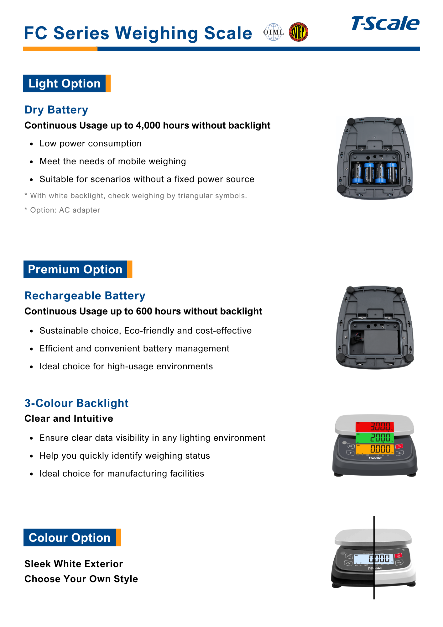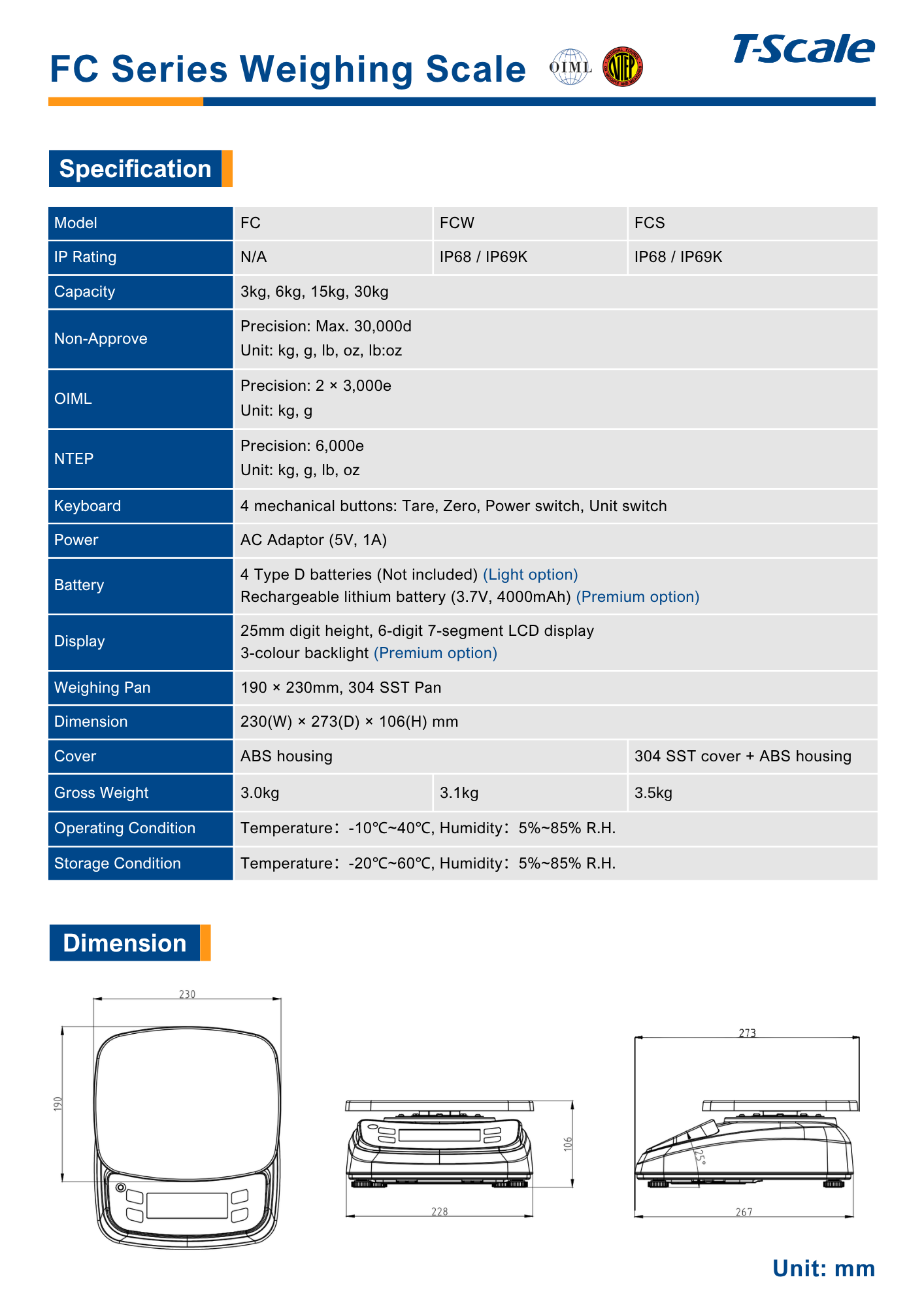 Approval: OIML Capacities: 6kg/15kg/30kg Divisions: 2x3,000e; 15,000d; 30,000d Pan Size: 230 x 190 mm Display: 25mm digit LCD display with white LED backlight Keyboard: 4 keys mechanical Power Supply 1: 4 x 1.5V D alkaline batteries (optional) (not included) Power Supply 2: 3.7V/4000mAh lithium battery with AC adapter 5V/1A (optional)