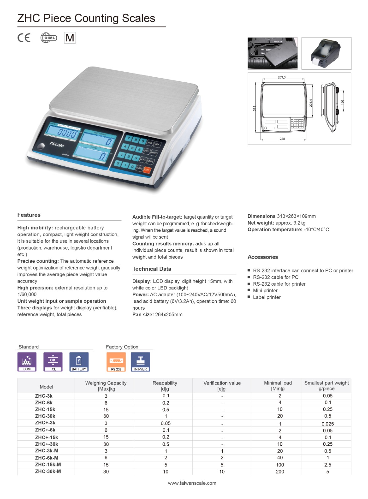 Approval : OIML Capacities:3kg/6kg/15kg/30kg Divisions: 3,000e; 2x3,000e; 30,000d; 60,000d Pan Size:204 x 263 mm Display:15mm digits LCD display with white LED backlight Key Board:20 keys membrane Battery: 6V/3.2Ah Lead-acid rechargeable battery up to 60 hours continuous use Optional:RS232